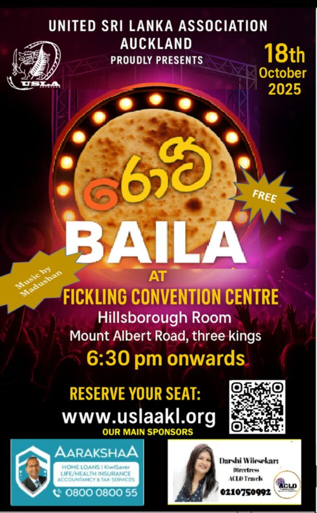 The United Sri Lanka Association (USLA) Auckland proudly presents Roti Baila Night 2025, an unforgettable evening of music, dance, and delicious food! Get ready to dance the night away to the best Baila beats with live music by Madushan, while enjoying authentic Sri Lankan food and a vibrant community atmosphere. ✨ Highlights: Live Baila music & entertainment Sri Lankan food and refreshments A lively cultural celebration with family and friends 🔗 Reserve your seats now: www.uslaakl.org Come and celebrate an evening full of rhythm, flavour, and fun — the true spirit of Baila!